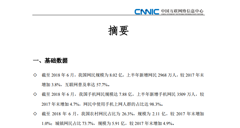 根據(jù)第42次《中國(guó)互聯(lián)網(wǎng)絡(luò)發(fā)展?fàn)顩r統(tǒng)計(jì)報(bào)告》顯示,截止2018年6月,我國(guó)網(wǎng)民規(guī)模為8.02億,上半年新增網(wǎng)民2968萬人,較2017年末增加3.8%,互聯(lián)網(wǎng)普及率達(dá)57.7%。截止2018年6月,我國(guó)手機(jī)網(wǎng)民規(guī)模達(dá)7.88億,上半年新增手機(jī)網(wǎng)民3509萬人,較2017年末增加4.7%,網(wǎng)民中使用手機(jī)上網(wǎng)人群的占比達(dá)98.3%。截止2018年6月,我國(guó)農(nóng)村網(wǎng)民占比為26.3%,規(guī)模為2.11億,較2017年末增加1.0%;城鎮(zhèn)網(wǎng)民占73.7%,規(guī)模為5.91億,較2017年末增加4.9%。