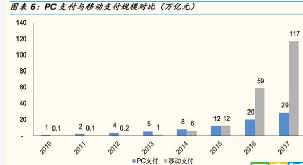 第一組數(shù)據(jù):艾瑞咨詢和國企證券研究所推出的:PC支付與移動支付規(guī)模對比數(shù)據(jù)