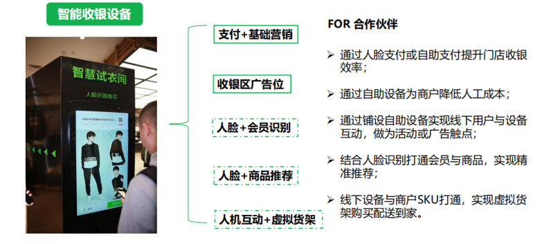 對于商戶來說,最大的好處就是收銀更加便捷了,在下班人流高峰期的時候,減少收銀排隊問題,另外商戶可以通過這種自助購物設備來實現(xiàn)會員管理、營銷、大數(shù)據(jù)分析,而人臉支付設備的ERP虛擬貨架更是為商戶解決了清點庫存和庫存統(tǒng)計的繁瑣工作。