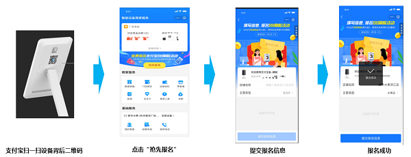 商戶工作人員使用支付寶掃描蜻蜓背后二維碼,進入“智能設備商家服務”專區(qū),點擊【支付寶88刷臉狂歡日報名】進入報名頁面,填寫真實信息并提交即設備報名成功。