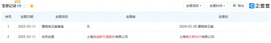 文章來(lái)源:四九八網(wǎng)絡(luò)發(fā)布時(shí)間:2025-03-19 14:14:48熱度:433近日,企查查顯示,上海索迪斯萬(wàn)通服務(wù)有限公司的企業(yè)名稱(chēng)已變更為“上海普樂(lè)斯支付有限公司”。