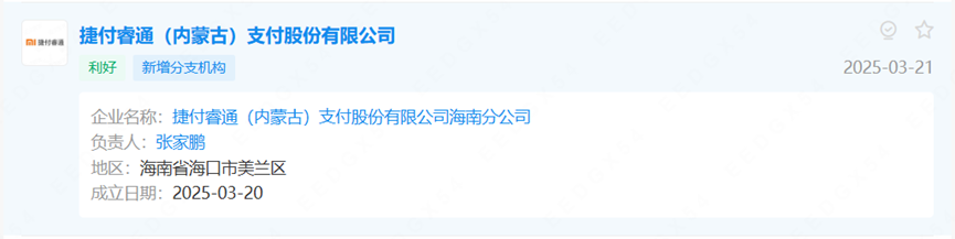 文章來源:四九八網(wǎng)絡(luò)發(fā)布時(shí)間:2025-03-27 09:07:02熱度:399近日,捷付睿通(內(nèi)蒙古)支付股份有限公司(簡稱“捷付睿通”)近日再新增一家分支機(jī)構(gòu)——捷付睿通海南分公司。該分支機(jī)構(gòu)成立于2025年3月20日,負(fù)責(zé)人為張家鵬。