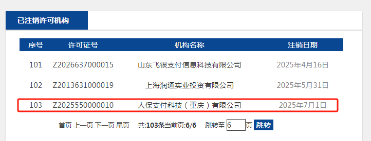 這是繼得仕股份有限公司、中匯電子支付有限公司、匯明商務服務有限公司、上海銀生寶電子支付服務有限公司、山東飛銀支付信息科技有限公司、上海潤通實業(yè)投資有限公司后,2025年央行注銷的第7張支付牌照,截至目前,已注銷的支付牌照數(shù)量增至103張,剩余持牌支付機構為168家。
