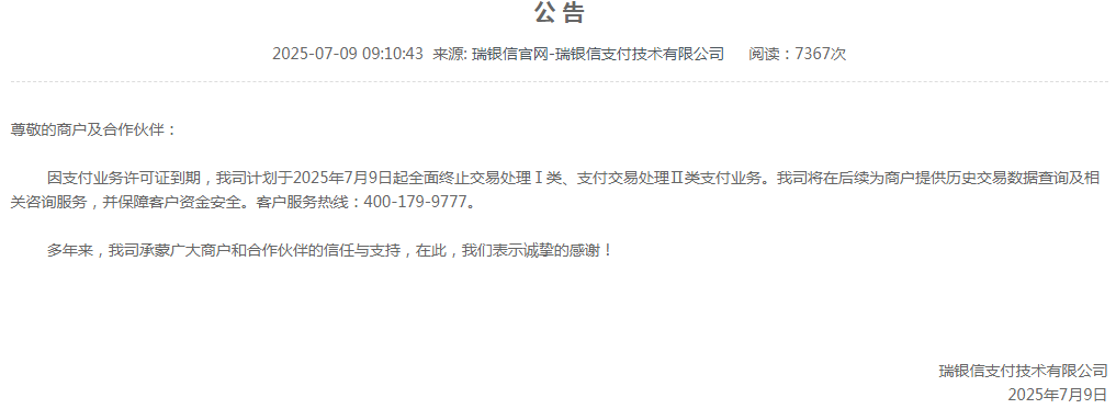 文章來源:四九八網(wǎng)絡(luò)發(fā)布時間:2025-07-17 09:24:27熱度:2877月9日,瑞銀信支付技術(shù)有限公司(下稱“瑞銀信”)發(fā)布公告,因支付業(yè)務(wù)許可證到期,我司計劃于2025年7月9日起全面終止交易處理Ⅰ類、支付交易處理Ⅱ類支付業(yè)務(wù)。我司將在后續(xù)為商戶提供歷史交易數(shù)據(jù)查詢及相關(guān)咨詢服務(wù),并保障客戶資金安全。