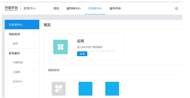 從這里你可以創(chuàng)建應(yīng)用,進(jìn)行沙箱環(huán)境測(cè)試,兩種方式都可以,區(qū)別是,如果您使用沙箱環(huán)境來(lái)創(chuàng)建應(yīng)用是不需要簽約的,而使用支付寶接口,是需要與支付寶簽約,還需要下載支付寶的Demo,導(dǎo)入開(kāi)發(fā)工具中,然后修改配置文件即可。這里我給大家演示的是使用沙箱環(huán)境來(lái)對(duì)接。